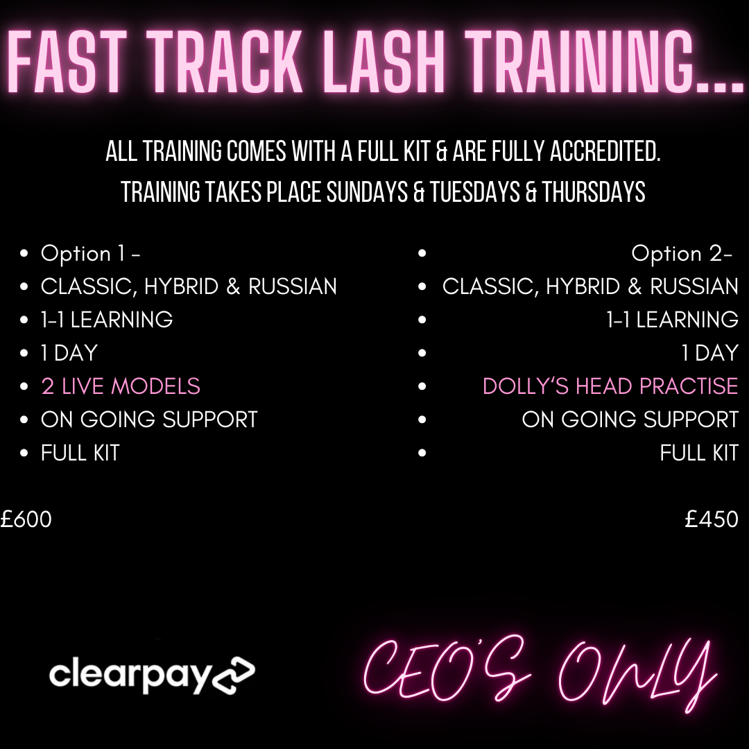 For bookings please purchase below, you can pay the deposit then the rest in person. All dates are below and can be chosen from. We offer a fast track service which includes Classics-Hybrids and Russians, as well as a Classic Course, any enquires please message @thelashtech_ on instagram.